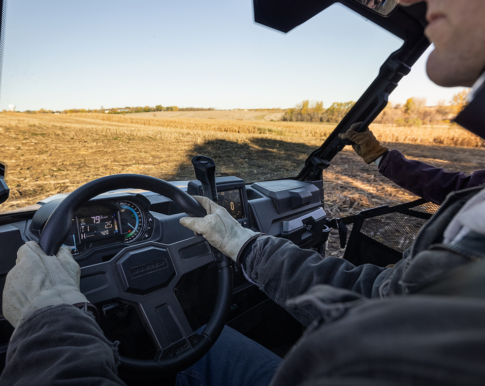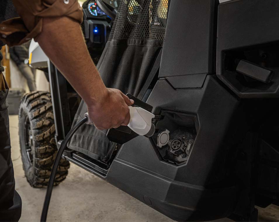 Center Mounted 7" Glove Touch Display with EV Infotainment (includes Range Remaining, Battery State of Charge, Charging Status, Launch Indicator, System Diagnostics and more), Speed Limiting, Plow Mode, Group Ride, GPS Navigation, Air Temp., Bluetooth, AM/FM Radio, Driver's Side Dual-sweep Analog Dials w/ 4" Multi-Color LCD Rider Information Center: Power Use and Regen %, Battery State of Charge %, Range Remaining, Charging Rate, Battery Temperature, Motor Temperature, Accessory Voltage, Speedometer, Odometer, Tripmeter, Gear Indicator, Service Indicator and Codes, Programmable Service Intervals, Seat Belt Reminder, User Selectable Backlighting & Brightness, Clock, Premium Cut & Sew Seats with Contoured Seatbacks and Embroidered Polaris Branding, Premium Steering Wheel and Interior Accents, Polaris Pulse Electrical System (6 position), DC Outlet, Dual USB Port, Cargo Box Located 12V SAE Port with In-Dash On/Off Switch, In Dash Speakers, Rear Camera, *Connectivity with Ride Command + App