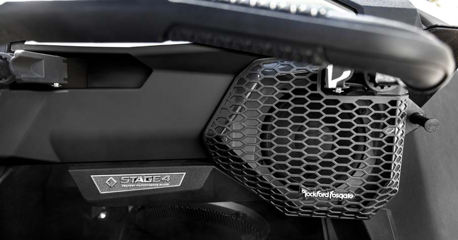 Factory Tuned & Integrated Rockford Fosgate Stage 4 Audio System with RIDE COMMAND Source Unit. Includes (2) 100 watt 1-inch tweeters, (2) 100 watt 6.5-inch component front speakers, (2) 100 watt 6.5-inch coaxial rear speakers, (1) 400 watt 4-channel amplifier, and (1) 10-inch subwoofer with an integrated 400 watt subwoofer amplifier. *Audio System is IPX7 and IPX9K water immersion tested to withstand the wet elements.
